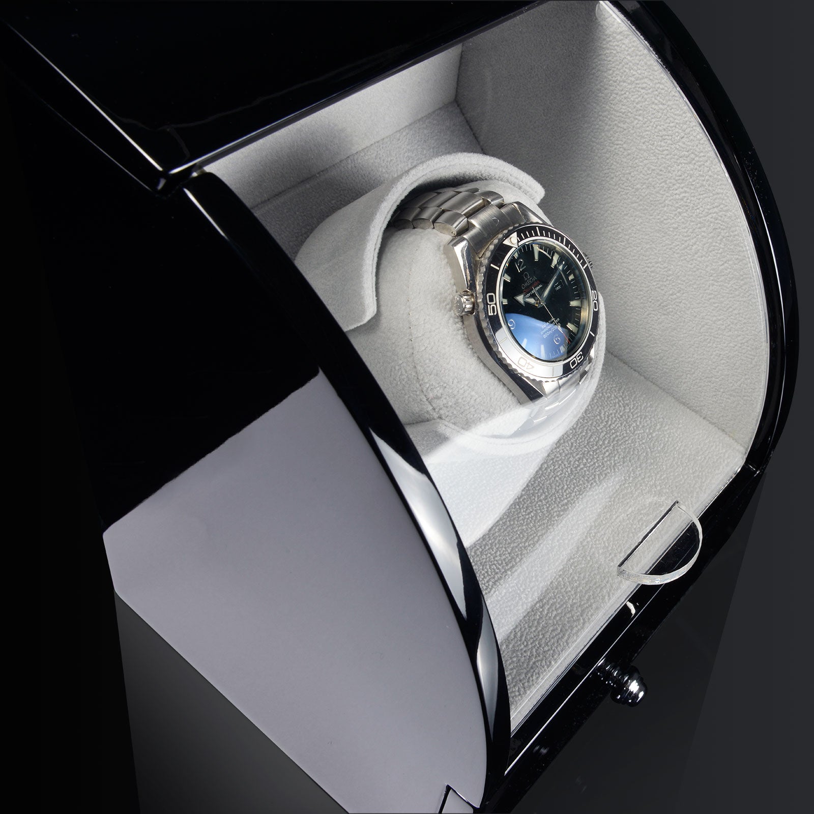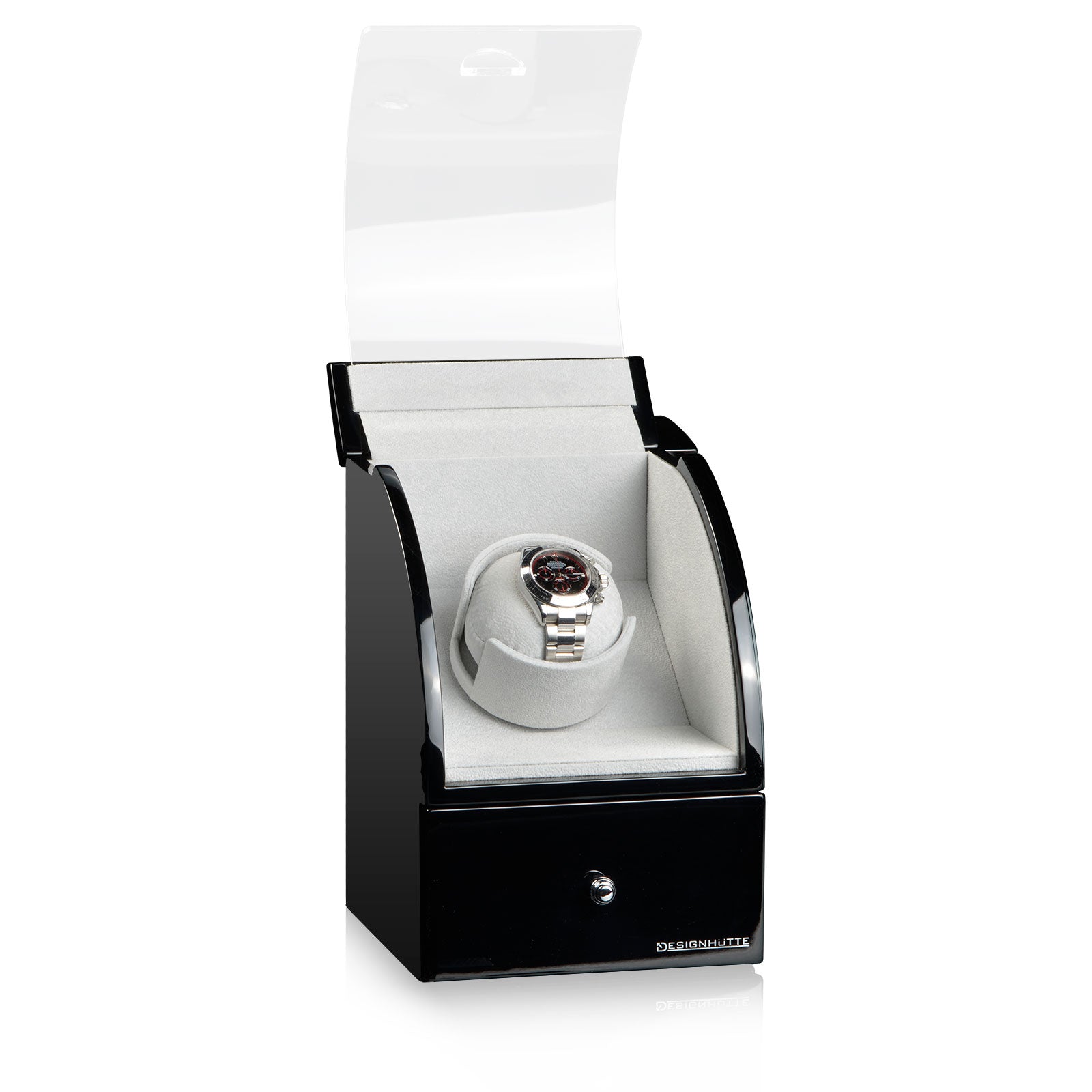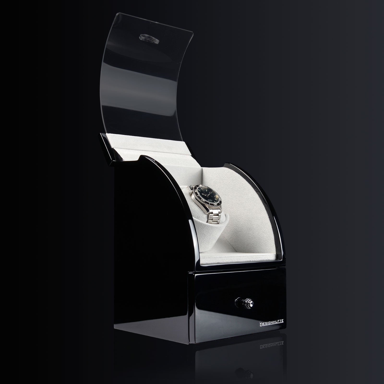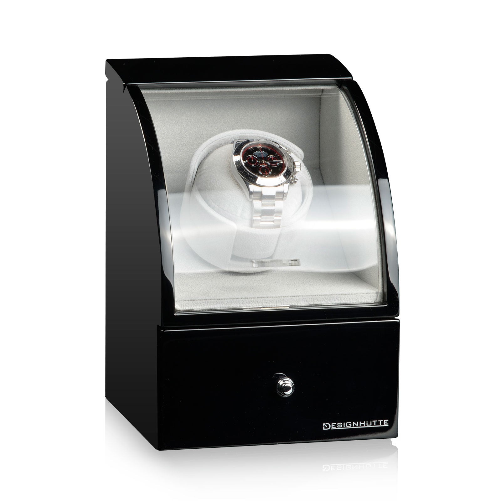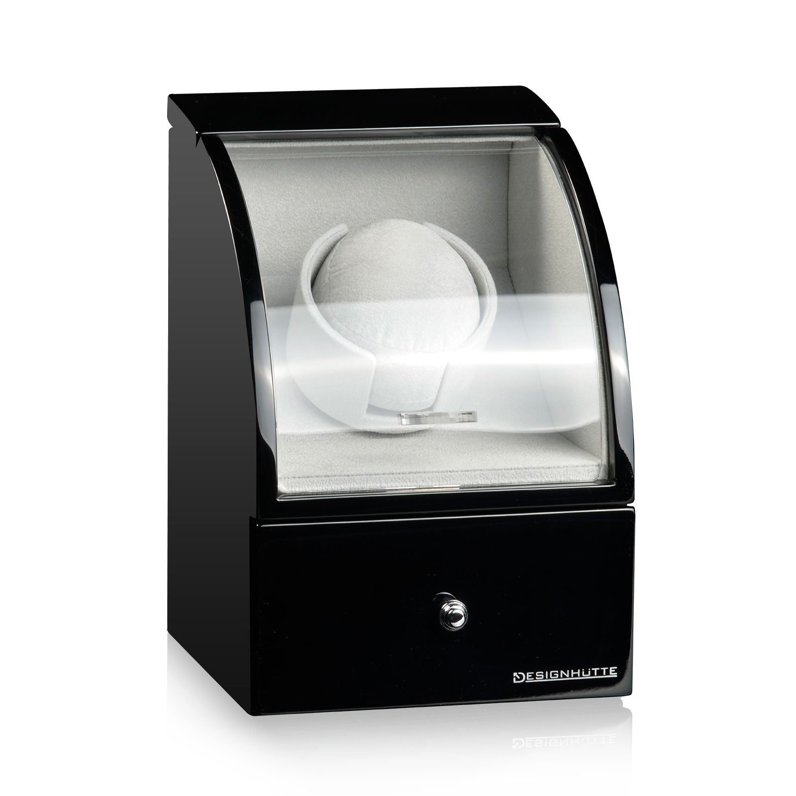 The extraordinary design of the Basel LCD watch winders has been inspiring watch enthusiasts for years. The curved shape of the case clearly stands out from other ranges and gives this series an unparalleled degree of charm and character. Depending on the preferred size of the watch winder, up to six watches can be wound up without any problems. Soft watch cushions provide a secure hold during the rotation. The integrated drawer offers the possibility to store up to four more watches or alternatively smaller valuables. The individual motors of the watch winders for two, three and six watches are programmed via the innovative Designhütte LCD control. In the single-watch version, the setting is made by means of a rotary control.