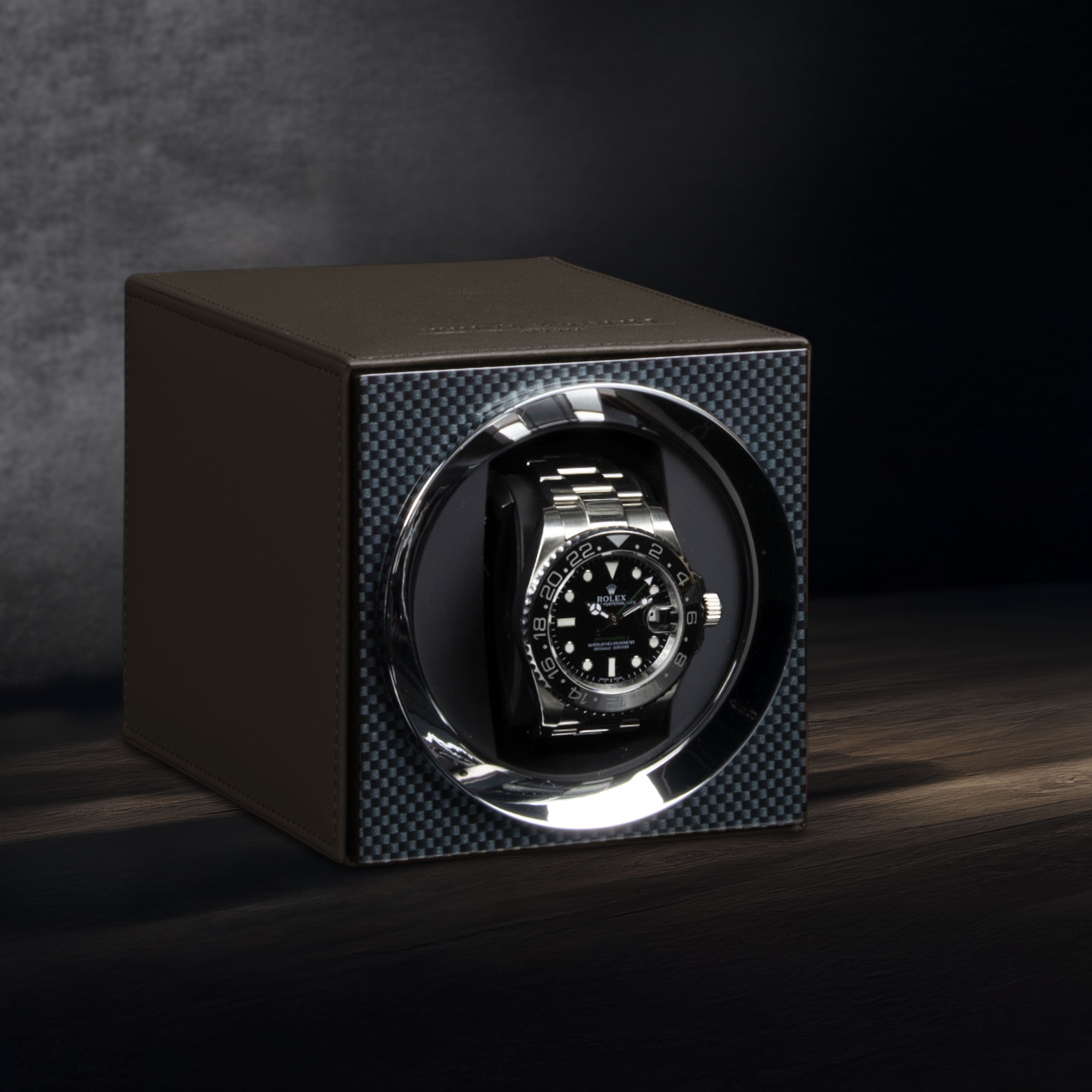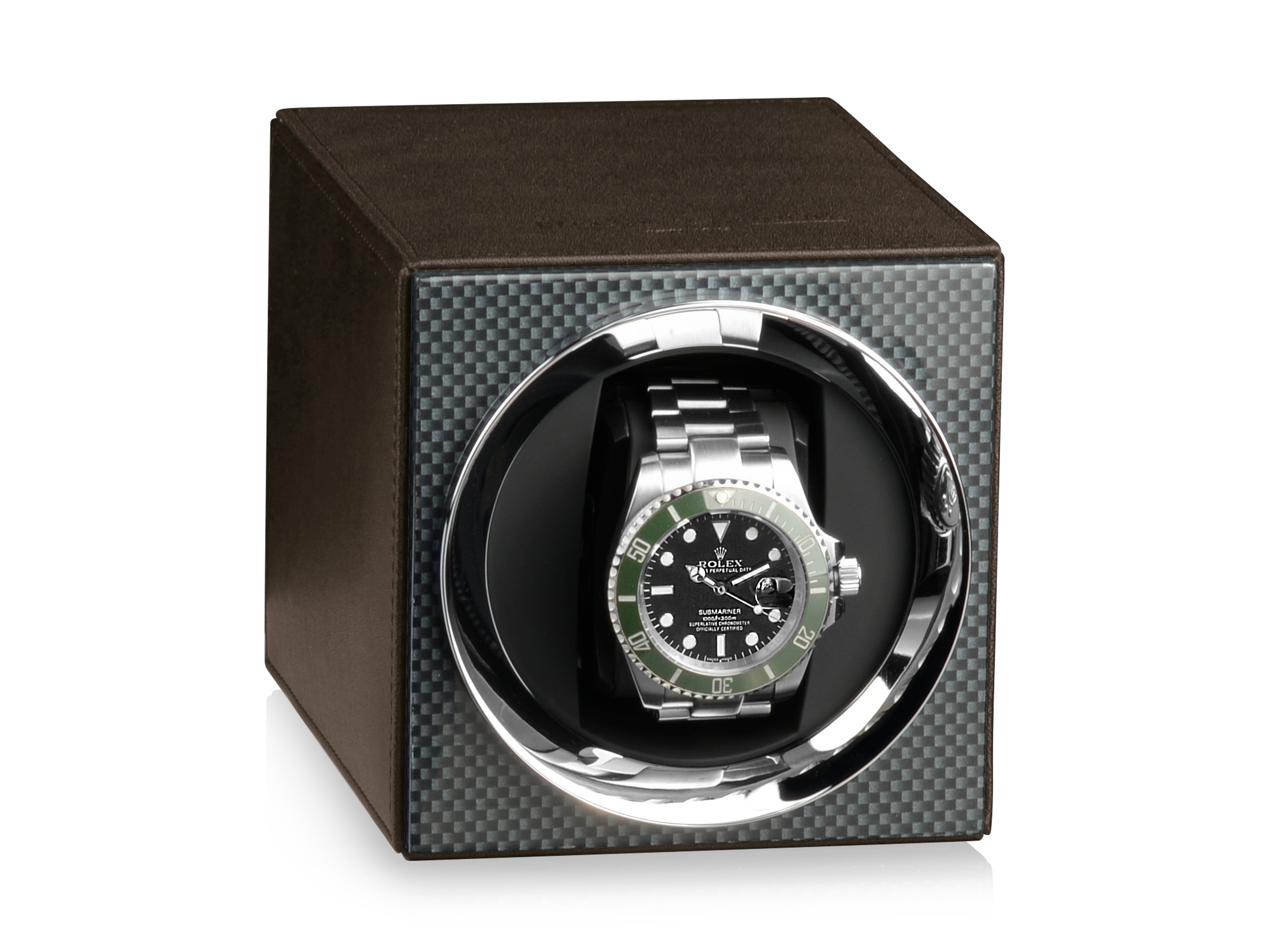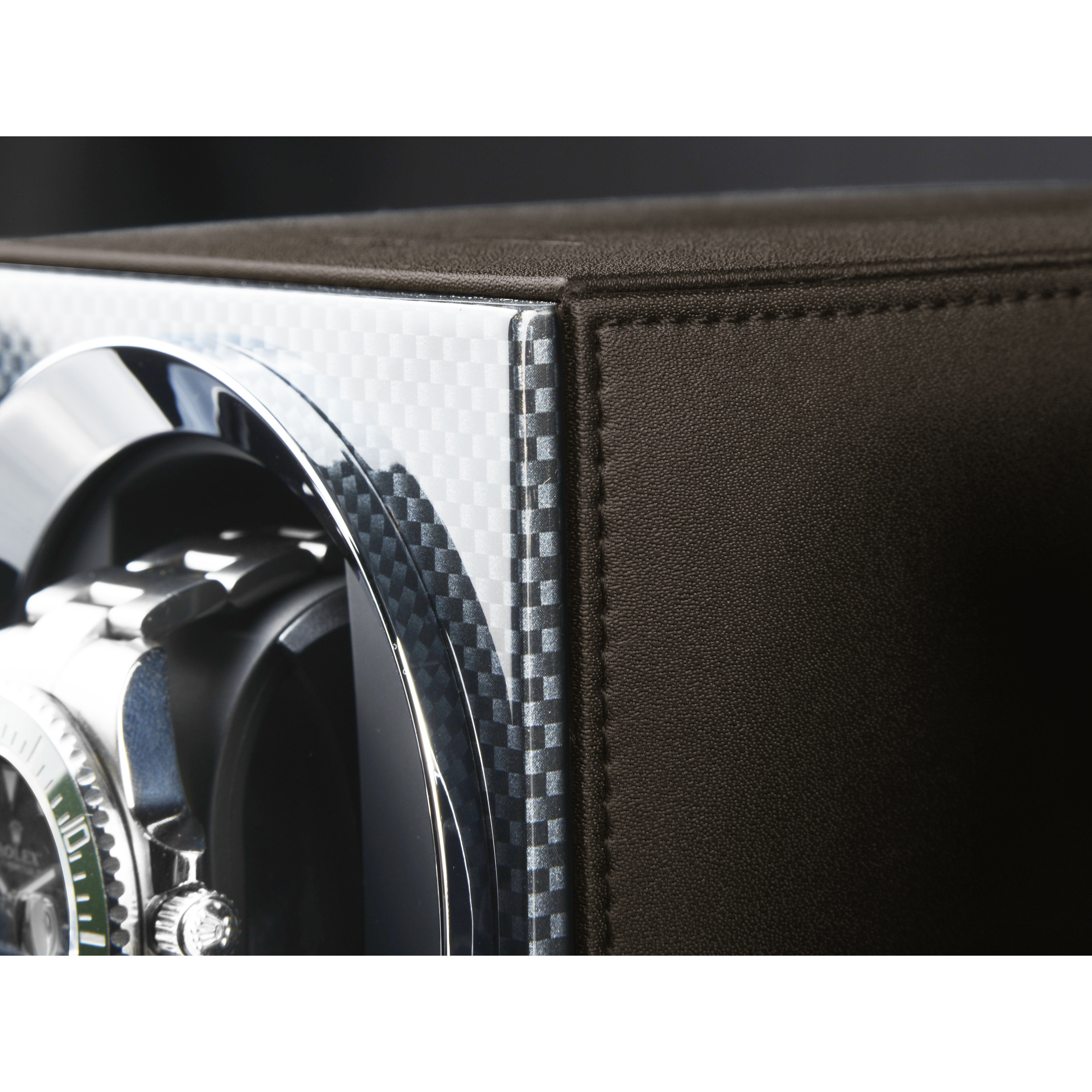 As was the case with David and Goliath, size does not always matter. The watch winder Moon inspires all those who want a small, functionally strong and battery operated watch winder. The four available programs ensure that automatic watches are wound without problems. The combination of specially developed drive technology and noise insulation allows an especially quiet operation. The chrome bezel, elegantly integrated into the design of the watch winder, ensures attractive reflections and dynamics.