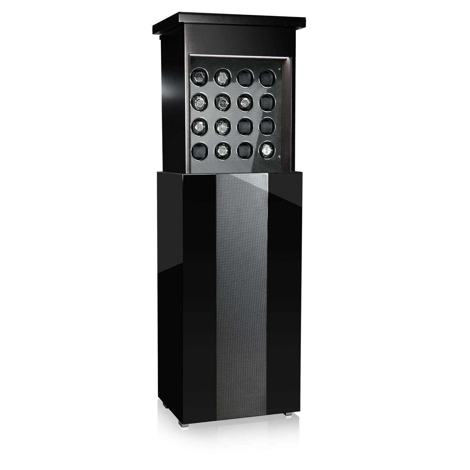 Les "Monuments du Temps" de la marque de luxe Chronovision sont à la fois des objets design autonomes et des remontoirs de montres. Ils impressionnent par leur aspect élégant et moderne ainsi que par leur fonctionnalité, élaborée jusque dans les moindres détails. La série Empire y ajoute encore un autre aspect : la sécurité discrète. Une fois fermé, l'objet apparaît comme un socle décoratif qui ne révèle rien de ses trésors intérieurs. Ce n’est que lorsque vous touchez les boutons poussoirs invisibles incrustés dans le bois que le corps s’étend doucement vers le haut, révélant sa technologie de remontoir pouvant accueillir 16 montres. L'éclairage intérieur LED à intensité variable sur plusieurs niveaux garantit que vos montres sont toujours mises en valeur sous leur meilleur jour. Bien entendu, l'éclairage est réglable via l'application.