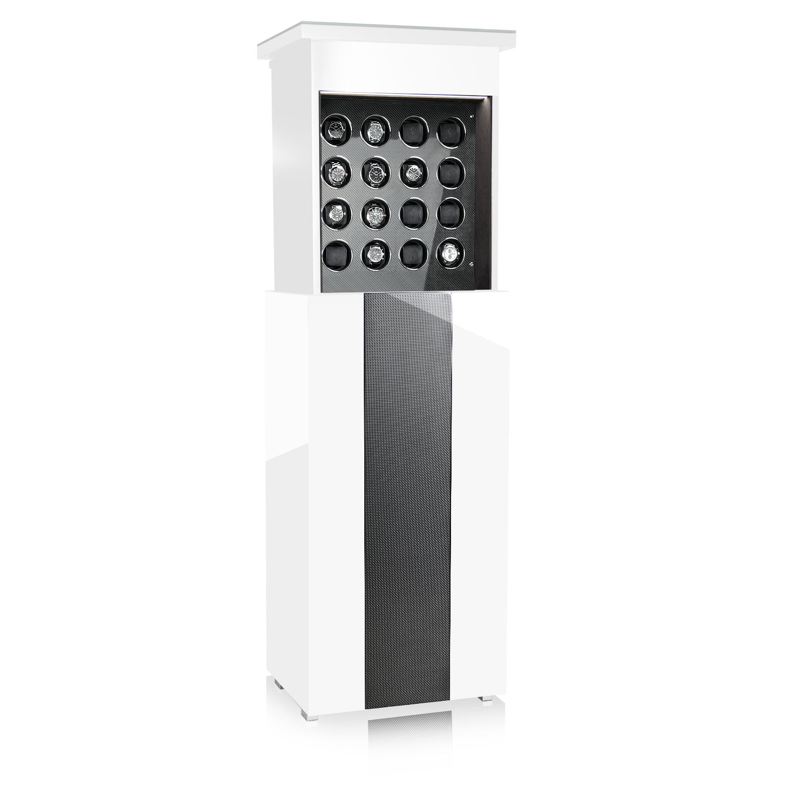 Les « Monuments du Temps » de la marque de luxe Chronovision sont à la fois des objets design autonomes et des remontoirs de montres. Ils impressionnent par leur aspect élégant et moderne ainsi que par leur fonctionnalité, élaborée jusque dans les moindres détails. La série Empire y ajoute encore un autre aspect : la sécurité discrète. Une fois fermé, l'objet apparaît comme un socle décoratif qui ne révèle rien de ses trésors intérieurs. Ce n’est que lorsque vous touchez les boutons poussoirs invisibles incrustés dans le bois que le corps s’étend doucement vers le haut, révélant sa technologie de remontoir pouvant accueillir 16 montres. L'éclairage intérieur LED à intensité variable sur plusieurs niveaux garantit que vos montres sont toujours mises en valeur sous leur meilleur jour. Bien entendu, l'éclairage est réglable via l'application.
