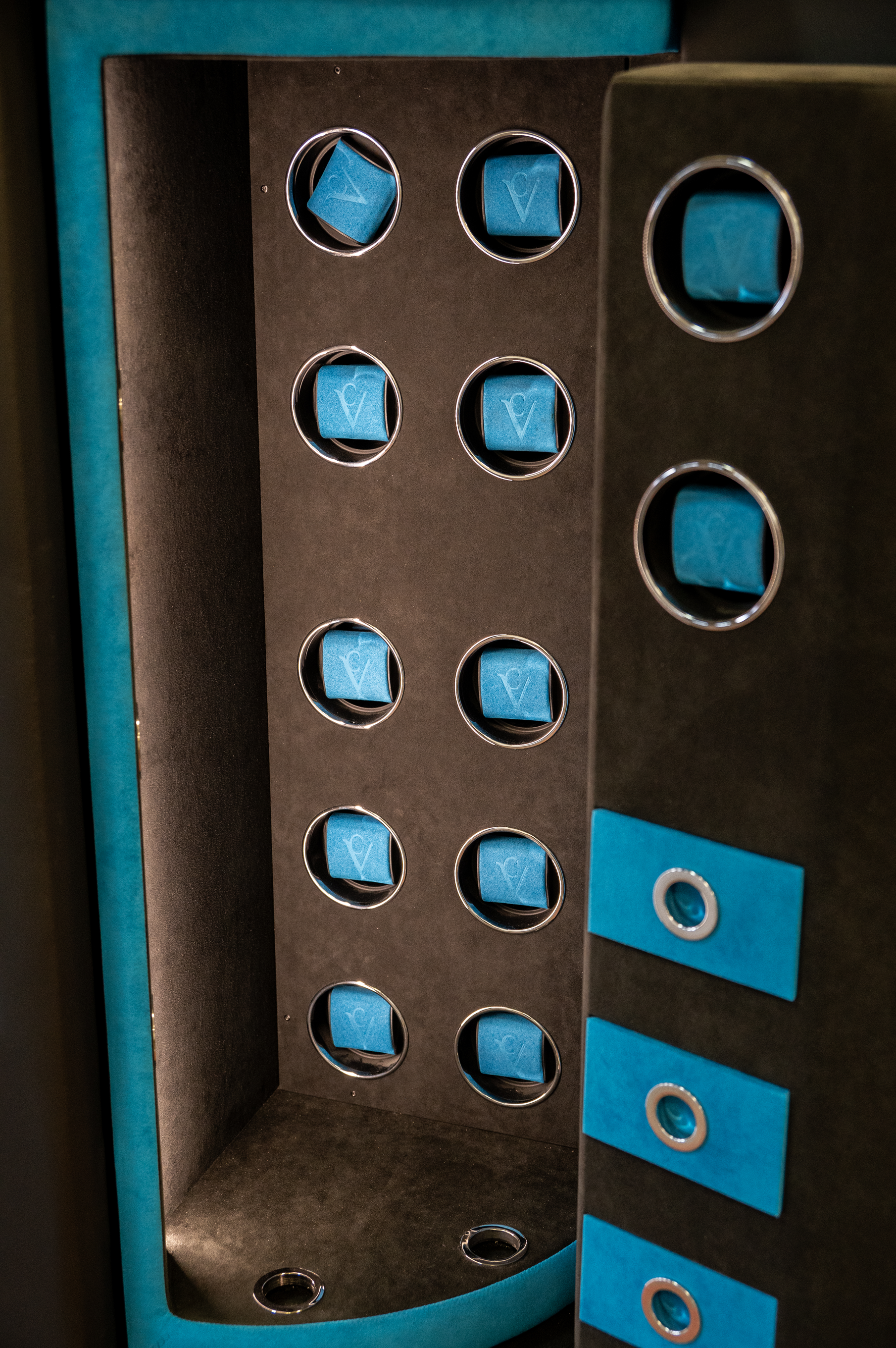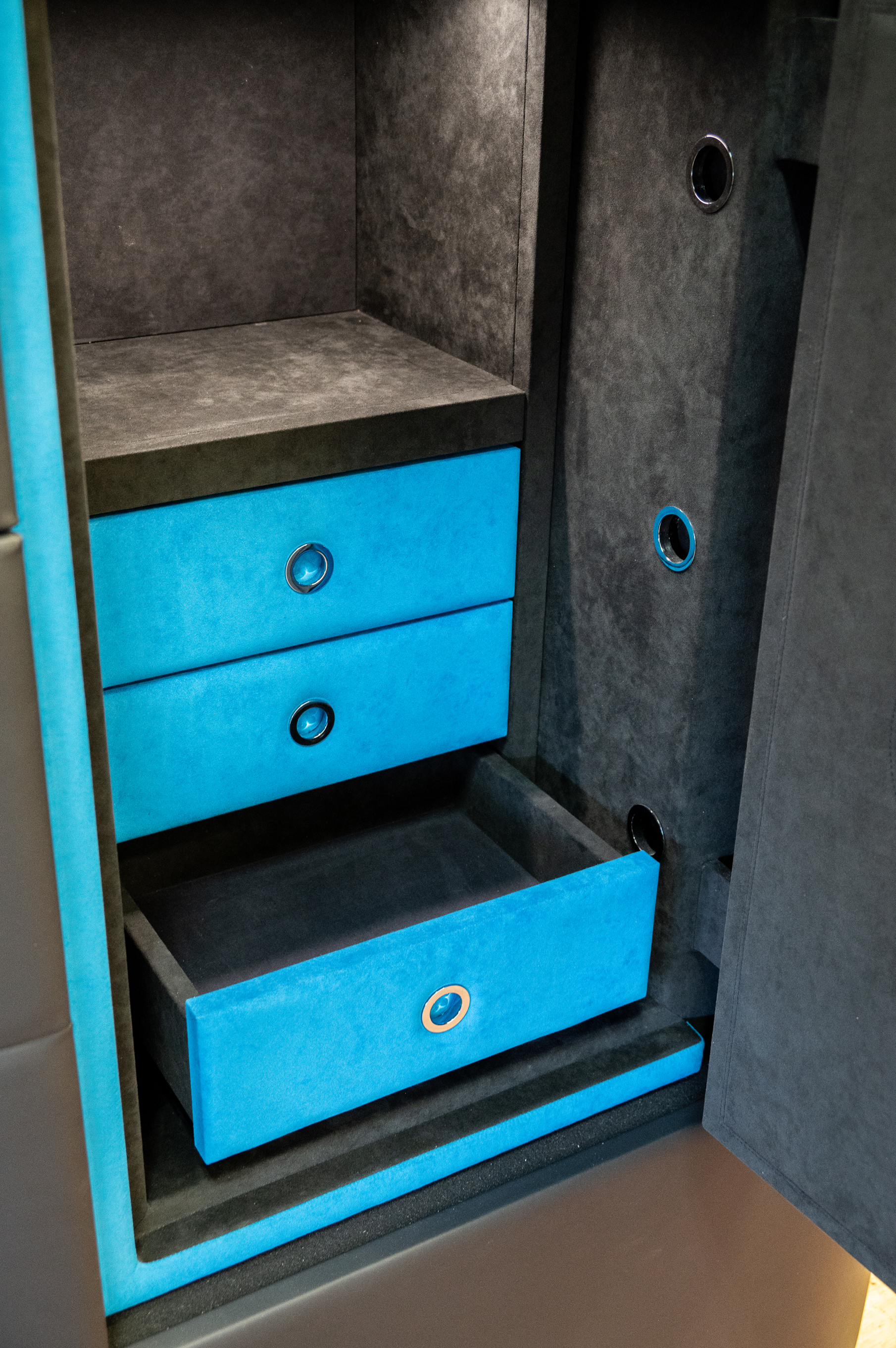 Luxury Interior: Elegant blue and charcoal leather interior with three drawers, designed for refined organization of watches and valuables.